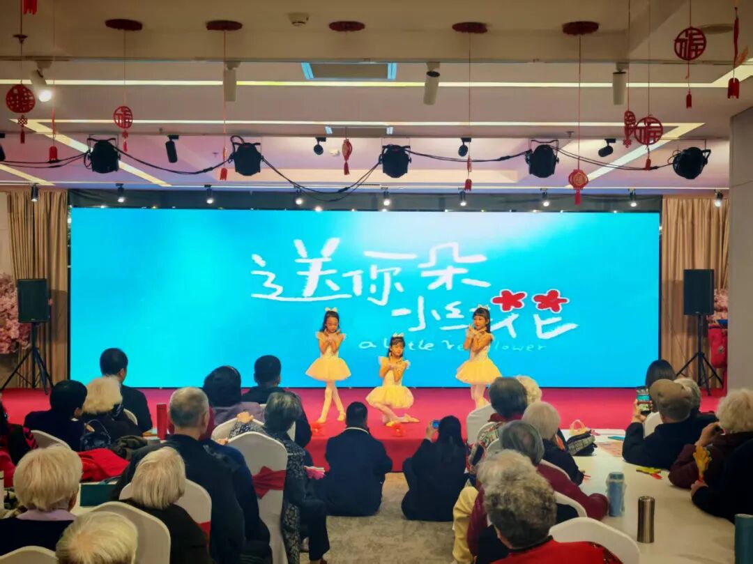 演出在萌力十足的儿童舞蹈《送你一朵小红花》中拉开帷幕。来自保税区文化中心的文艺团队,为老人们带来了形式多样、内容丰富的节目,诗朗诵《老有老的骄傲》、女声重唱《梨花颂》、双人舞《红高粱》、男声小合唱《再见了大别山》等精彩节目依次上演,京剧《白毛女》《红灯记》唱段响起时,经典的旋律再次点燃现场观众的热情,许多人情不自禁地跟着轻声哼唱,用手打着节拍,现场气氛高潮迭起。更令人动容的一幕是在演员们的热情邀请和台下观众的鼓励下,一位精神矍铄的老年戏迷兴致勃勃地登台,即兴献唱了《状元媒》的经典选段,虽然并非专业演员,但她字正腔圆、韵味十足的演唱,展现了深厚的戏曲功底和对生活的热爱,赢得了满堂喝彩。台上台下情感交融,欢呼声与掌声此起彼伏,温馨与感动的氛围弥漫在活动现场。