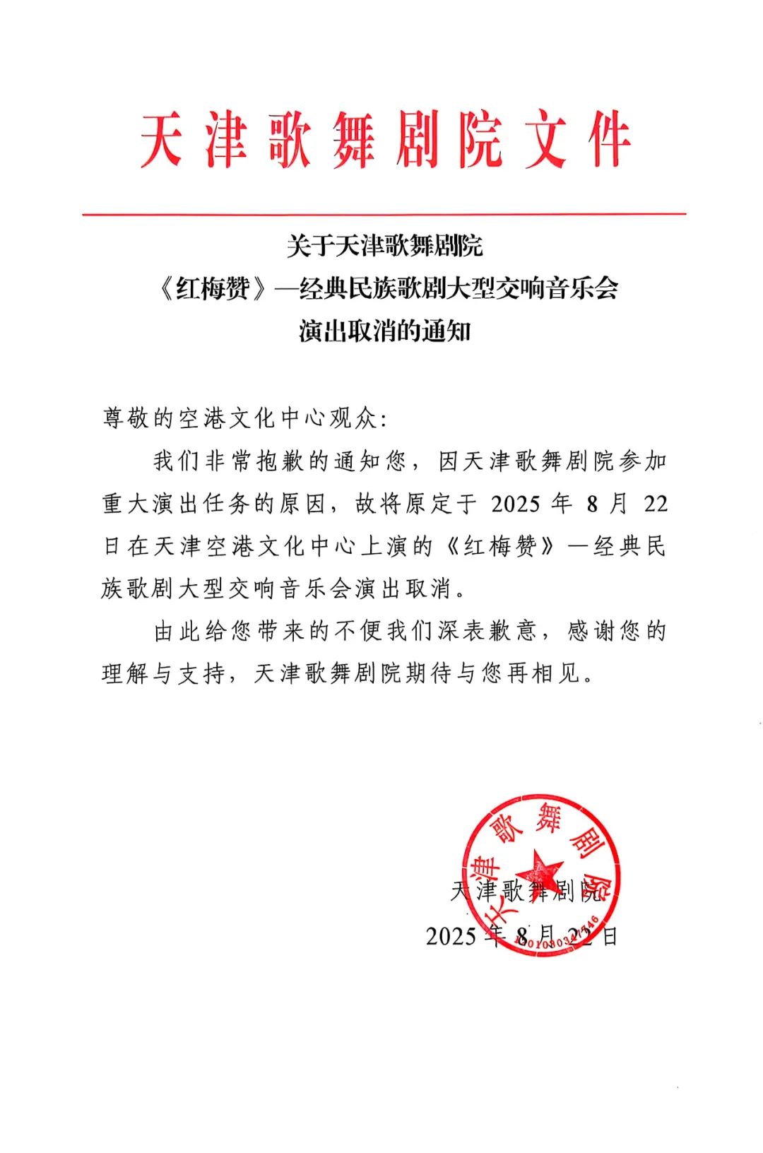 因天津歌舞剧院临时接到参加重大演出任务原因,故将原定8月22日的《红梅赞》—经典民族歌剧大型交响音乐会演出取消。