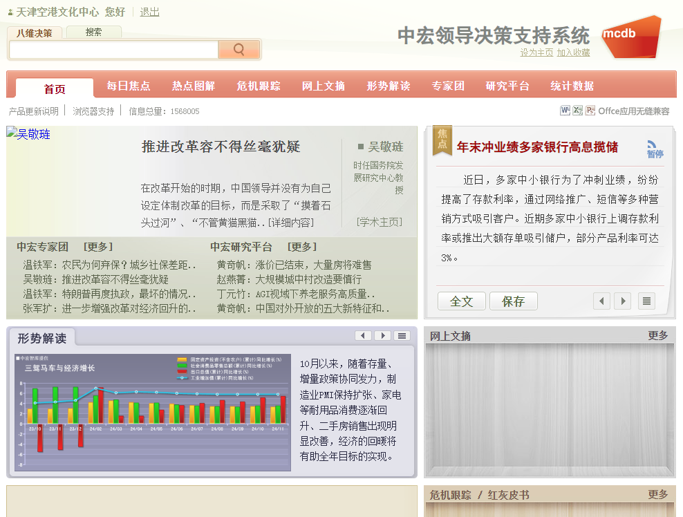 中宏领导决策支持系统是根据政务工作特点打造,提供了政府决策过程中从“信息资源保障”到“政府决策支持”的“一揽子”支持方案,信息及时广泛,服务全面周到。本产品全面收录了九十年代以来我国经济社会发展过程中各领域的文献信息、研究报告、统计数据等内容,信息量、数据量庞大。