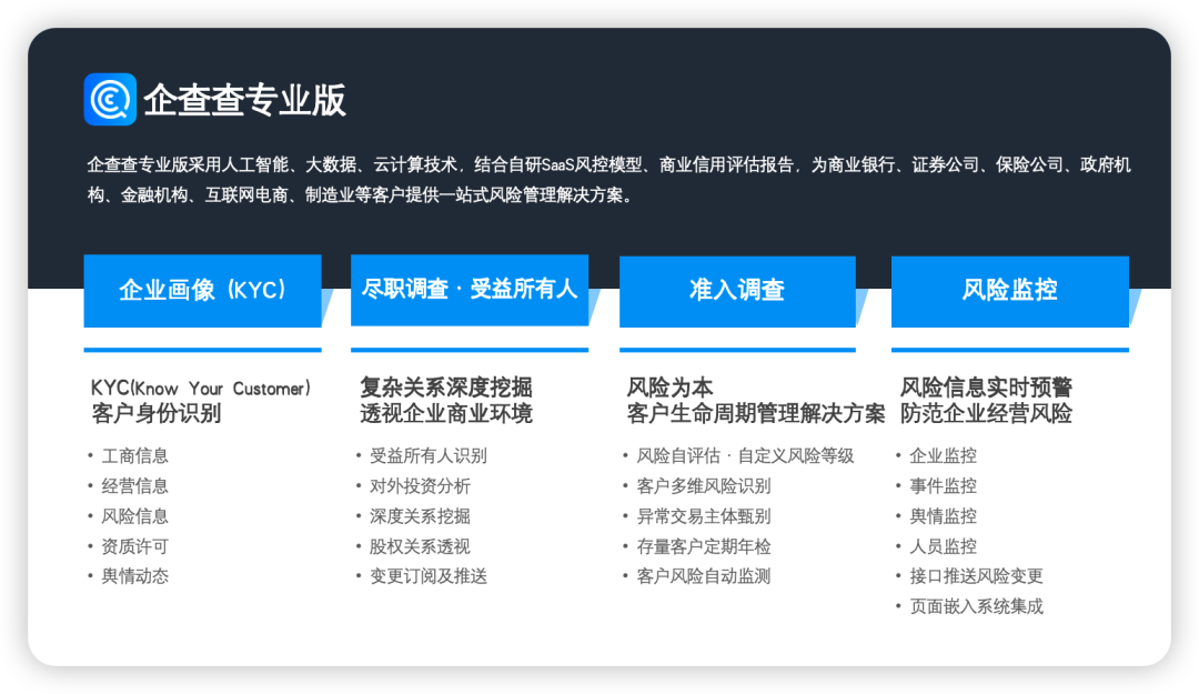 企查查是一款企业信用查询工具,立足于企业征信多维度信息整合,依赖强大的人工智能、大数据挖掘、可视化分析等技术,结合自研的风控模型、商业信用评估报告,为企业客户提供一站式解决方案。专注企业大数据,超3.5亿+企业征信信息,300+企业多维度信息。为高效赋能B端用户,企查查技术团队以全球5亿多家企业动态数据为底层架构,汇集国内80个产业链、8000个行业、6000个细分领域的商业信息服务平台,通过对行业的深刻洞察与技术的灵活应用相结合,企查查研发的SaaS产品可以为B端用户提供更贴近业务需求的技术服务。