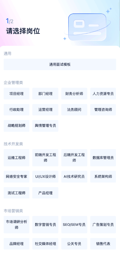 面向应届生、转行求职者等群体,我们引入热门职业面试模板,涵盖企业管理、技术开发等多个领域。通过真实场景模拟,帮助读者熟悉面试流程,面试后生成详细反馈报告,精准指出优化方向,为读者求职保驾护航。