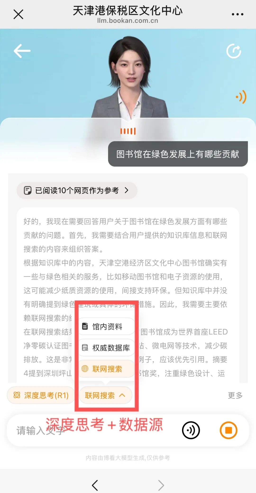 结合大模型与权威数据库,针对文化中心的文献解读、专业知识咨询等需求,提供逻辑清晰的解答及可信来源标注,助力读者精准高效获取知识。
