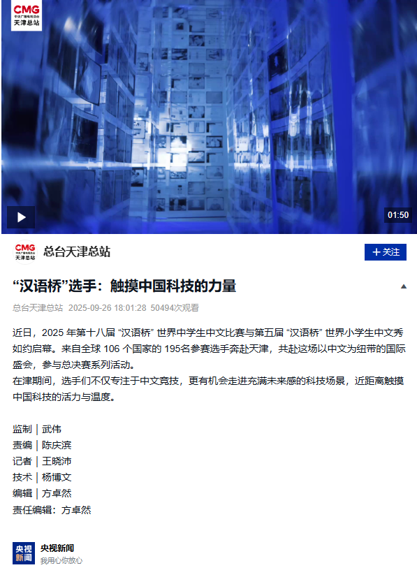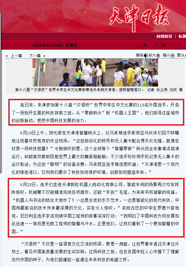 近日,第十八届“汉语桥”世界中学生比赛落下帷幕,这也是继2025年上海合作组织峰会落幕后,天津再次承办的国际性重大人文交流活动。活动中,外国学子到我区联想未来中心、新松机器人两家工业游点位探寻天津创新的脉动,感受中国科技的发展活力。系列活动获央视新闻、天津日报等多家媒体关注。