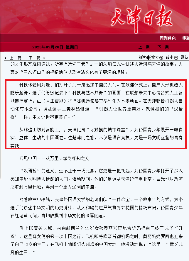 近日,第十八届“汉语桥”世界中学生比赛落下帷幕,这也是继2025年上海合作组织峰会落幕后,天津再次承办的国际性重大人文交流活动。活动中,外国学子到我区联想未来中心、新松机器人两家工业游点位探寻天津创新的脉动,感受中国科技的发展活力。系列活动获央视新闻、天津日报等多家媒体关注。