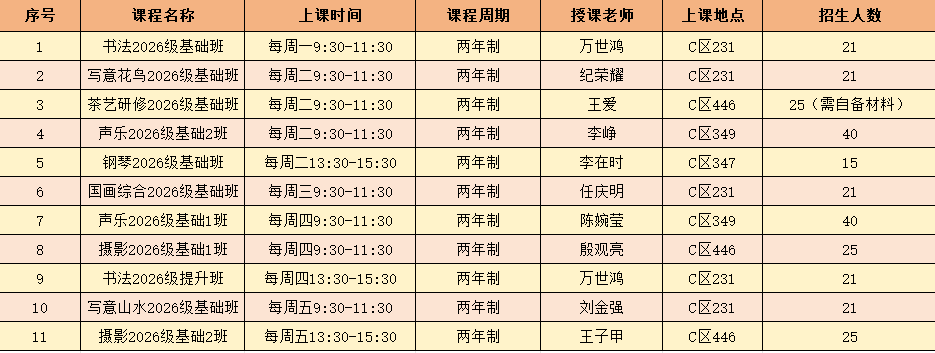 开课时间2026年3月初 ,按学期上课,每年两学期,每学期共计15次课程,每周1次课程,每次课程2小时。