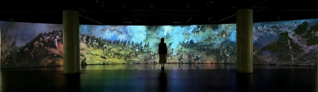 全景画既是一种独特的艺术形式,又是一种具有普遍性的意识形态。全景画艺术形式的独特性表现在其宏大的叙事主题,巨大的画面尺幅,合围式的的视觉结构等;全景画普遍性的意识形态体现在作品蕴含着对崇高性的追求,对家国情怀的表达,对民族记忆的表现。从创作论和鉴赏论考察,作为叙事性绘画,全景画有别于其他任何独幅绘画,她是将绵延的文学性内容转换成同样具有时间性的视觉逻辑,我们在创作和欣赏全景画过程中,无法以固定的视角覆盖她的全景和全貌,这种视觉逻辑结构无法以平面瞬间的方式呈现,由此,沉浸式体验成为全景画另外一个重要特征,这也是其诞生的主要原因。